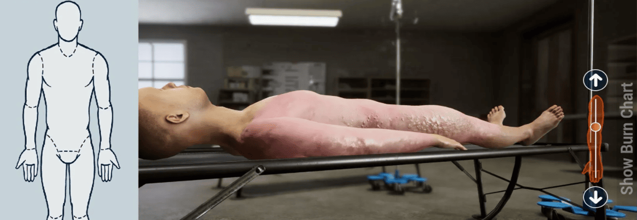 The Burn Computer Application for Research and Education (BurnCARE) will advance the Army’s ability to address complex burn care and handoff procedures. BurnCARE is a virtual patient medical trainer available on mobile platforms. It includes realistic burn visualizations synchronized with dynamic advanced physiology engine outputs. It addresses the full spectrum of care, from point of injury to long-term hospital care. Our solution creates novel virtual burn patient models currently not available to the Army for training applications.